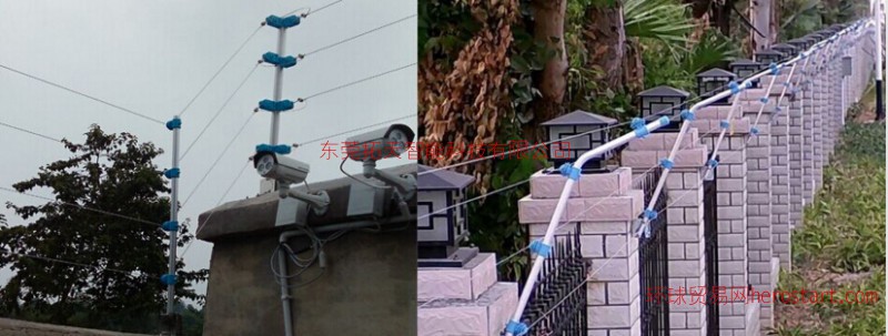 獨立式電子圍欄,直接架設在地面上。其高度約2米左右,一般安裝10-12根線纜。考慮到設備和人身安全,要求在獨立式電子圍欄的一側或兩側,安裝不低于1.2m的防護墻或圍墻。其間的凈空距離應不小于1m。使獨立式電子圍欄正常工作部位處于一個公眾通常難以接近的封閉區域內。